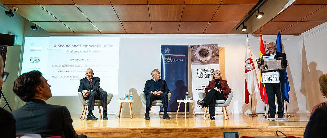 Otwierając wydarzenie, kierownik placówki Monika Krzepkowska podziękowała prezesowi Fundacji Carlos de Amberes, Miguelowi Angelowi Aguilarowi za wysiłki, które pozwoliły doprowadzić do spotkania dwóch wielkich osobistości ze świata polityki międzynarodowej. Podkreśliła rolę, jaką zarówno Aleksander Kwaśniewski, jak i Javier Solana odegrali w ustawieniu kursu Polski na cywilizację zachodu. Dodała, że doświadczenie gości oraz ich obecny brak zależności od koniunktury politycznej dają przywilej i swobodę mówienia prawdy ponad wszystko, co uczyniło dyskusję niezmiernie szczerą i wartościową. Podczas panelu A. Kwaśniewski i J. Solana przedstawili swoje przemyślenia i refleksje na temat przyszłości Europy, zestawiając je w kontekście własnych doświadczeń z kluczowych i przełomowych momentów w historii Europy.