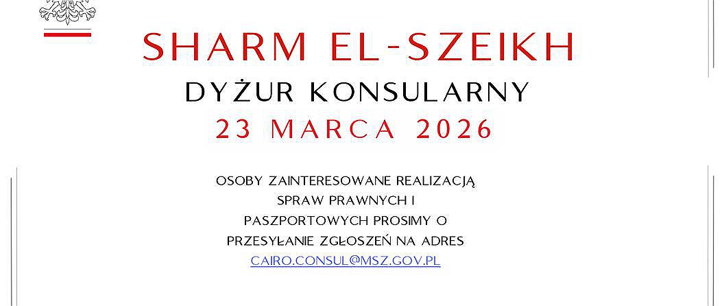 23 marca 2026 roku w Sharm el Sheikh odbędzie się dyżur paszportowy. Prosimy, aby osoby, które są zainteresowane udziałem przesłały zgłoszenie na skrzynkę mailową cairo.consul@msz.gov.pl